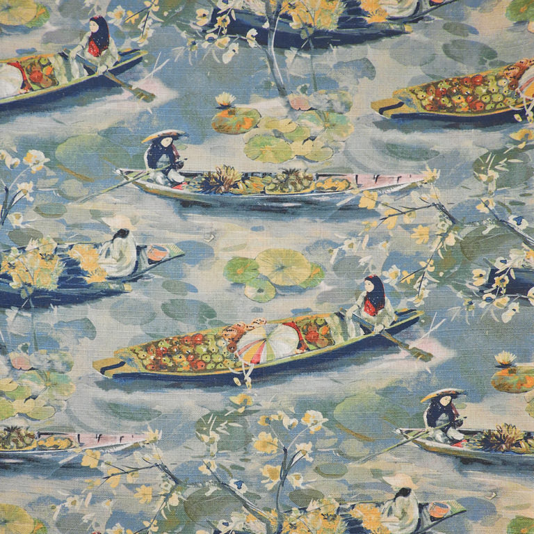 Infuse your interiors with a dynamic sense of place using R‑Bangkok River, a richly detailed floating-market scene printed on a soft textured poly-linen ground. Featuring deep blues, reds, oranges, and neutrals in a broad 27″×28″ repeat, this 54″ wide fabric brings global flair and tapestry-like beauty to upholstery, drapery, and pillows.